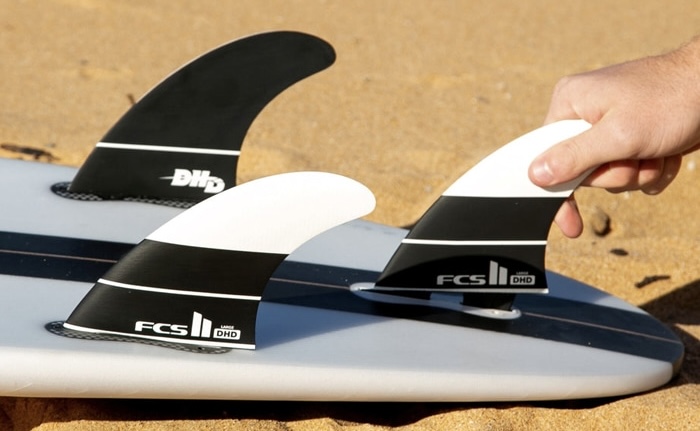 FCS II フィン根元にツメ(タブ)が2つ。 ネジ不要または1本ではめ込む、世界的に最も普及しているシステム。