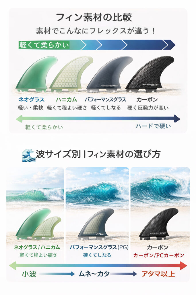 🌊 波サイズ別|フィン素材の選び方
